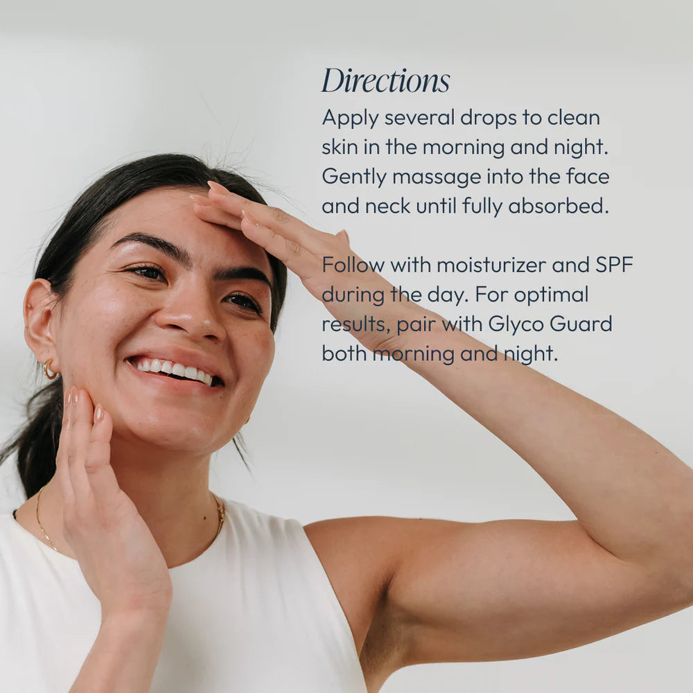 This light water based serum is specifically formulated to counteract the damaging results of unchecked glycation in the skin. Hyaluronic acid recruits moisture to the skin, while phytochemicals provide superior antioxidant and detoxification properties.
